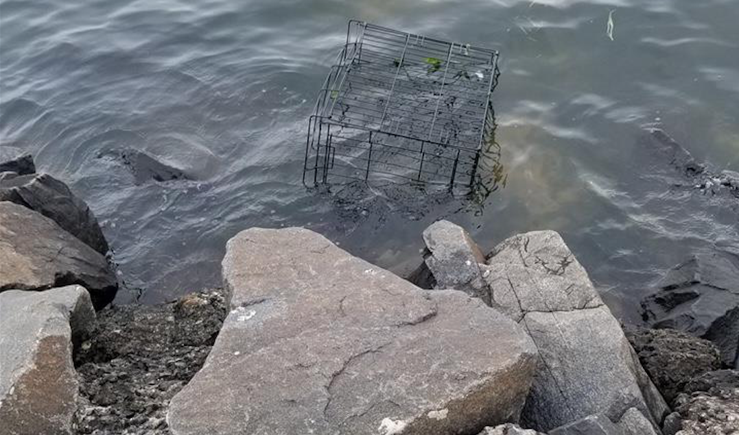 As the passerby investigated, a black wire cage with a small dog cowering inside was spotted. The cage was on a small portion of sand between the bulkhead and the water. The tide was coming in and the water had reached the cage.