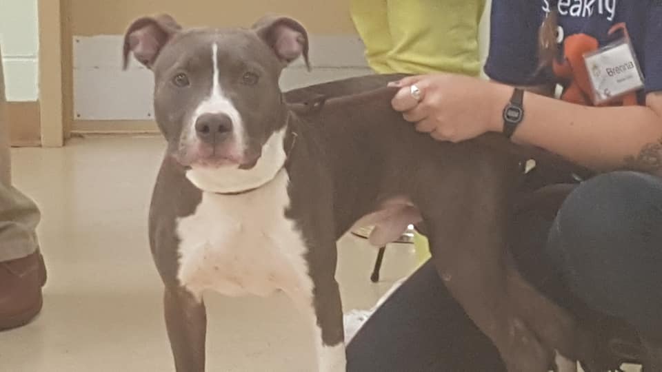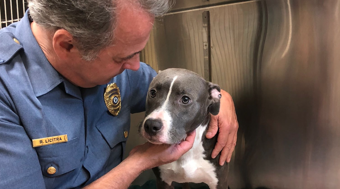 Due to the tide schedule, it is estimated that that the dog was placed there between 4 and 6 a.m.. The dog is a roughly one year old male gray and white pit bull.