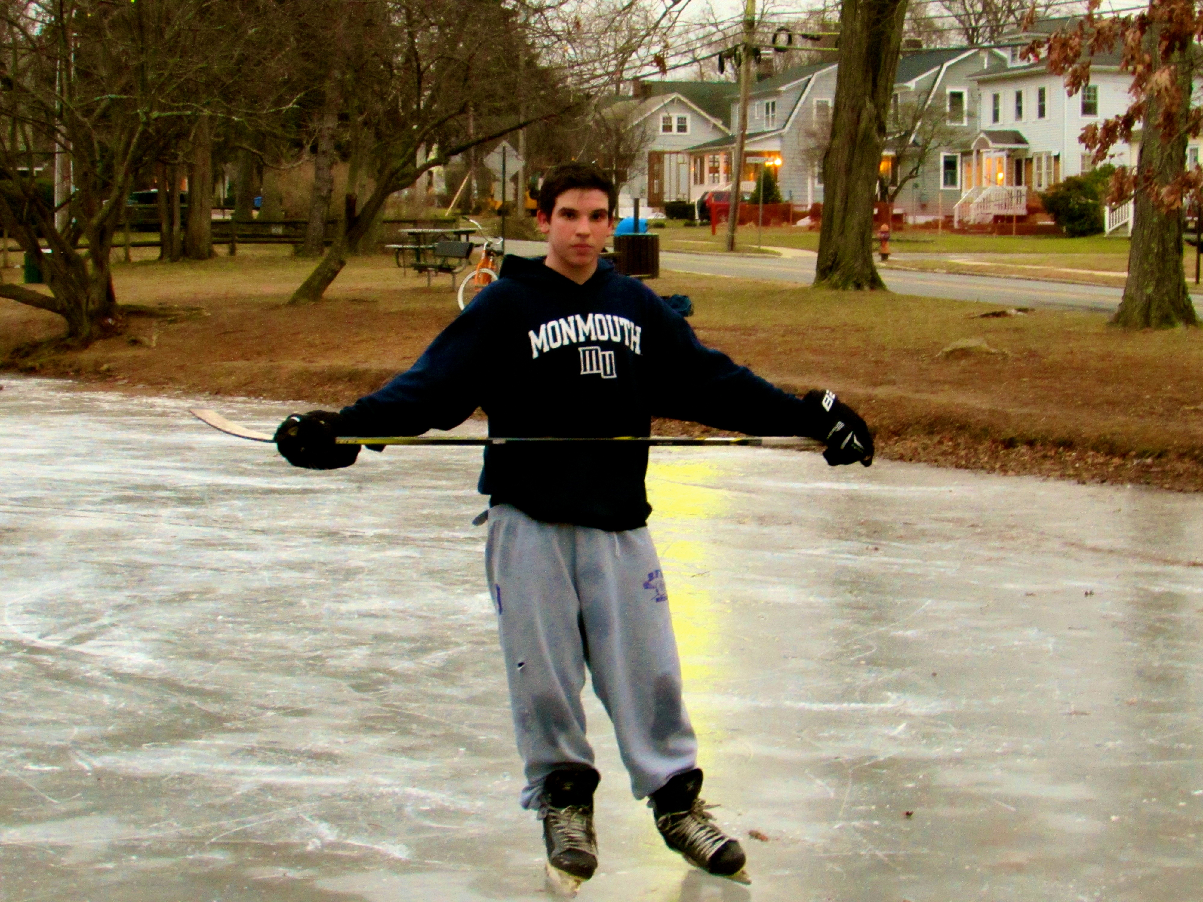Carson Kirman gets to the winter sport of hockey and skating on McCarter Pond in 2015