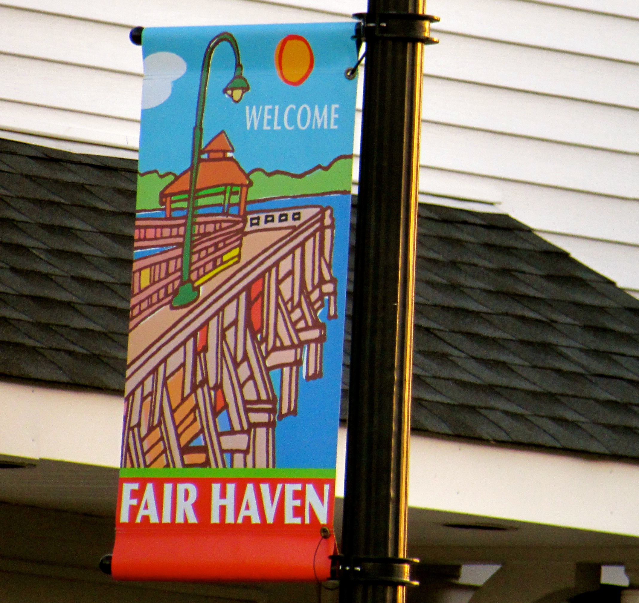 “We wanted the banners to be different,” Fair Haven Mayor Ben Lucarelli said. “Looking around at what other towns have done, we found that most had the classic blue fabric with white print and once iconic image. We also didn’t want to re-do what we had done for the centennial (which was to hold a contest among the kids and choose a winner). Those banners were blue and white and depicted the Albertina (the signature steam ship on Fair Haven’s logo).